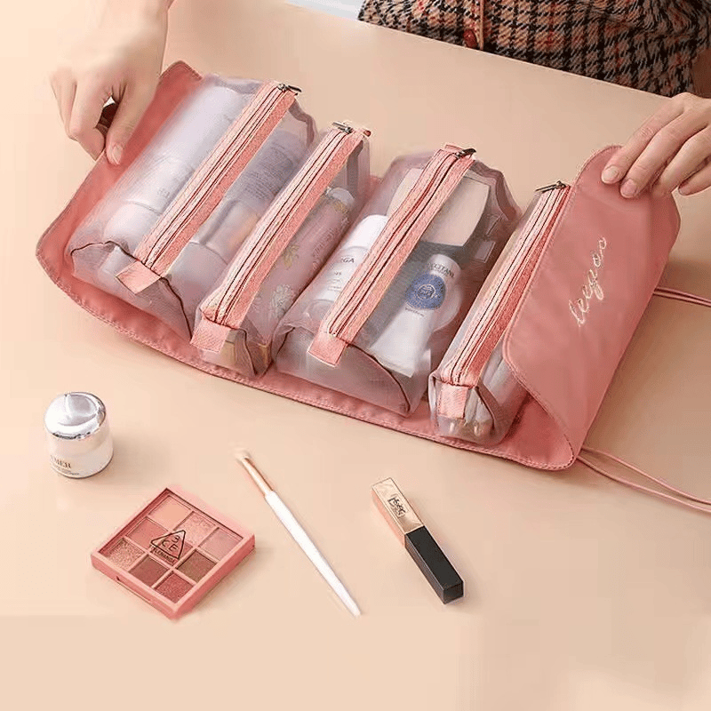 Four-in-one storage makeup bags can be used in combination or separated freely since bags are attached to Velcro. Adjustable straps are bundled for easy fixation, and items will not fall. The set can be hung, making full use of vertical space.